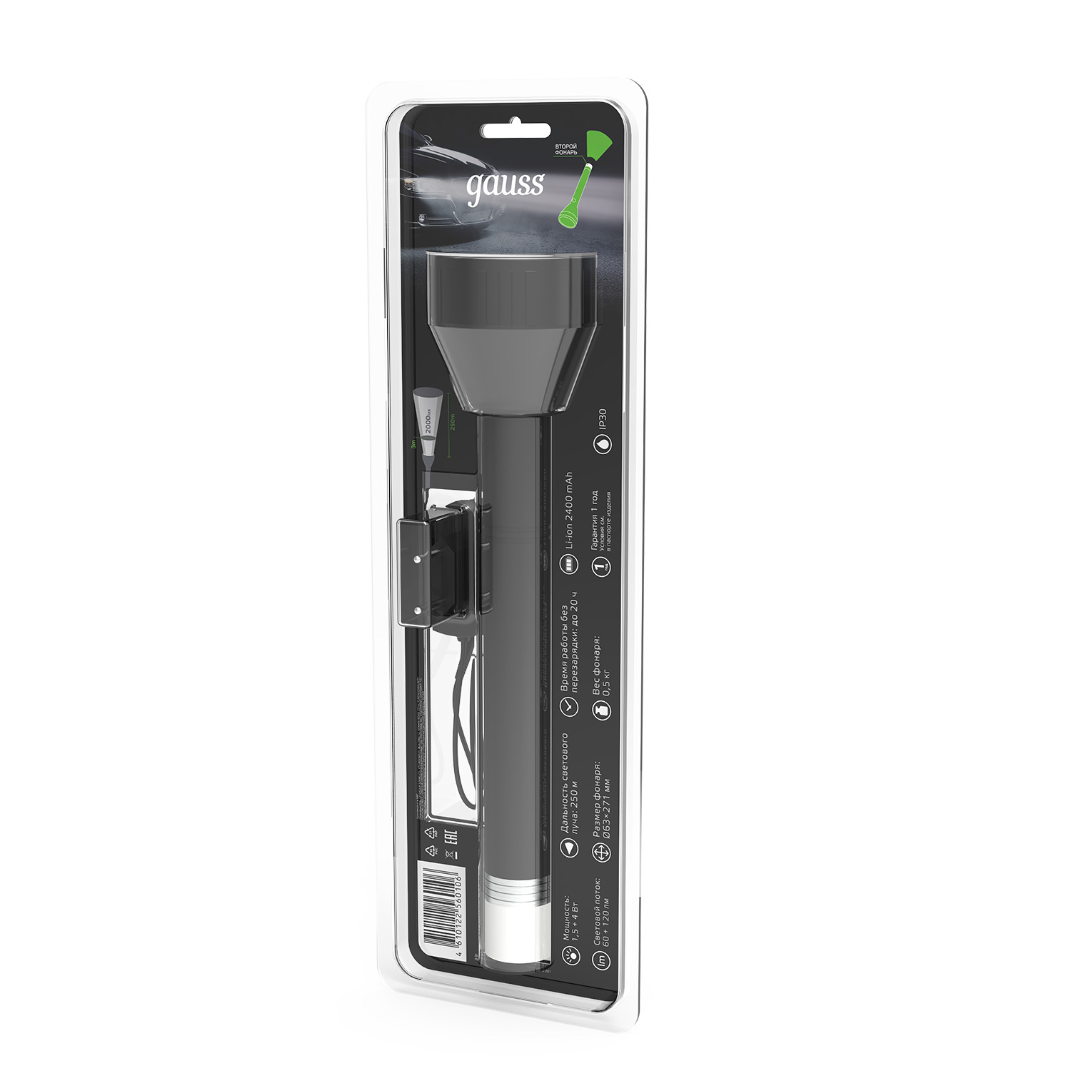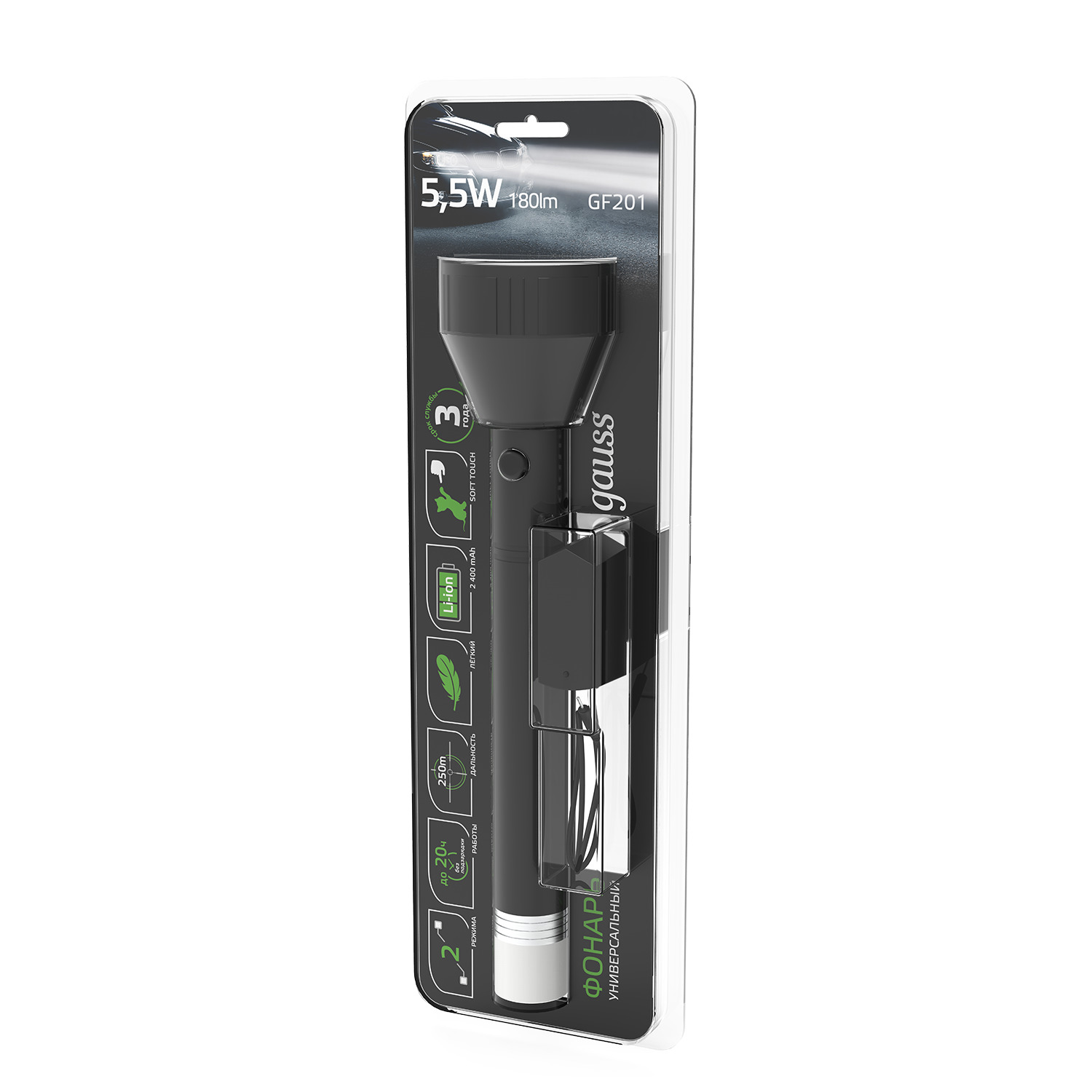 Фонарь ручной Gauss модель GFL201 2в1 имеет кроме основного сверхъяркого LED света световой поток которого 180лм, еще и дополнительный фонарь для кемпингового освещения. Дальность светового луча 250м. Классический дизайн с удлиненной ручкой и покрытие Soft touch делают его очень удобным в использовании. В комплект входит адаптер питания от сети для встроенного Li-ion аккумулятора, полного заряда которого хватает для беспрерывной работы до 20ч.