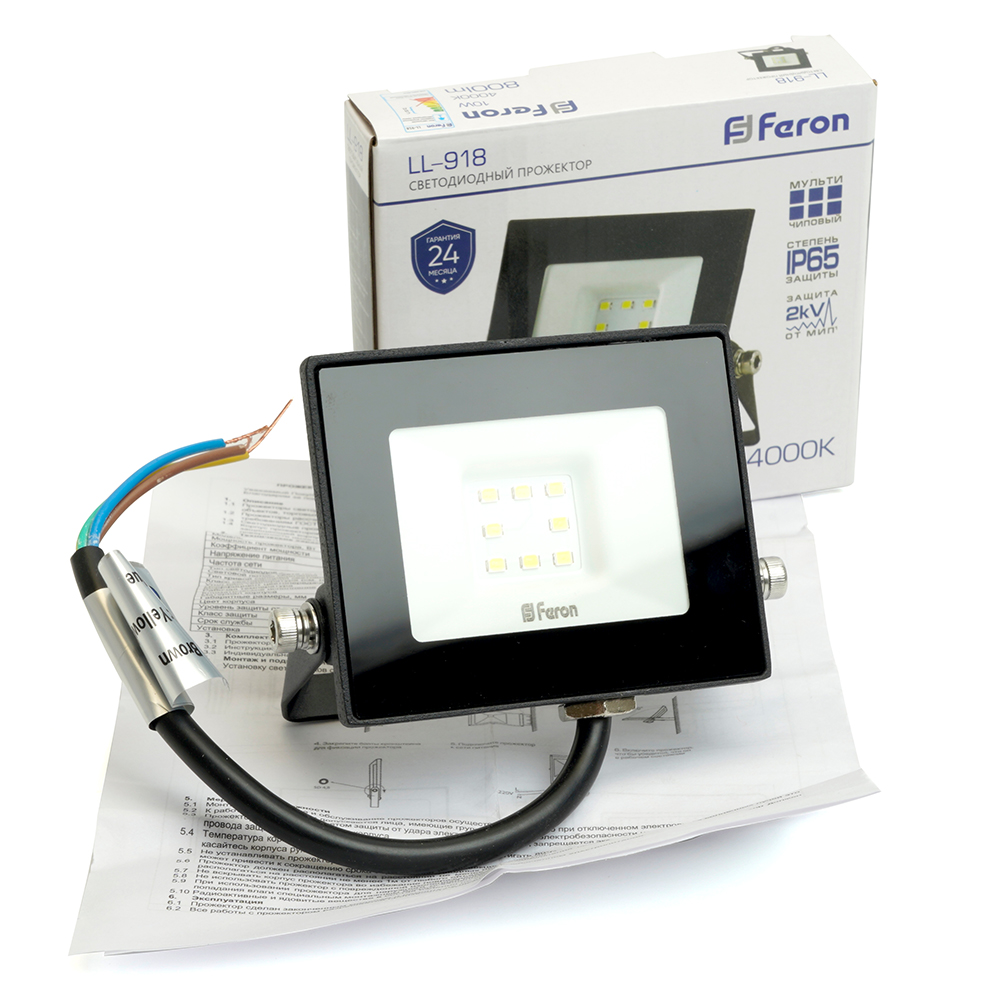 Прожектор светодиодный многоматричный с монтажным креплением на кронштейн, (ДО) FERON LL-918, 10W, 4000К (белый), 230V/50Гц, 1000Lm, IP65, угол рассеивания 120°,*SMD2835, раб.t -40°C - +40°C, цвет чёрный, корпус алюминий литой под давлением + стекло, 104*92*21 мм