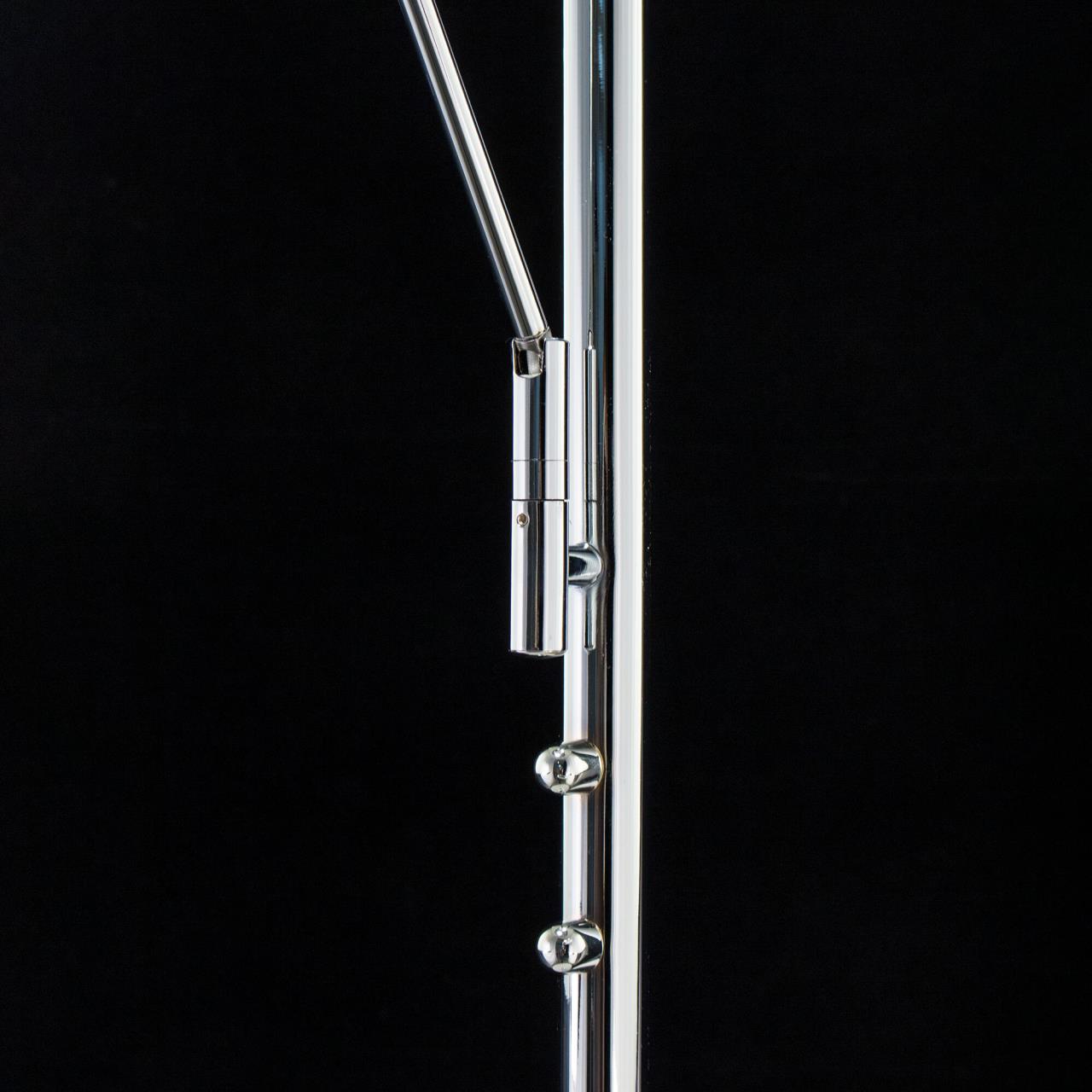 Торшер высотой 180 см с двумя регулируемыми по направлению светодиодными головами, диаметр основания 28см, потолочная голова D=28см с литым корпусом, мощностью18Вт с диммером 20-100%; голова для чтения D=13.5 см с литым корпусом, мощность 5 Вт с диммером
