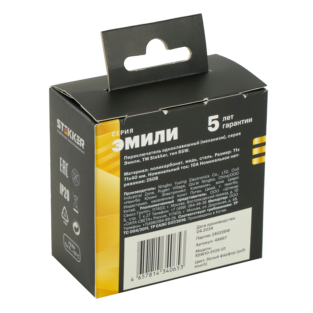 Выключатели одноклавишный STEKKER RSW10-5105-01, серия Эмили тип установки - скрытый, размер изделия 71*71*40мм., цвет белый фарфор, soft touch, материал изделия поликарбонат, латунь, сталь. Номинальное напряжение 250 , номинальный ток 10А, 20