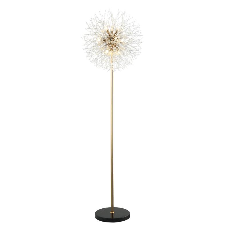 Торшер из коллекции Salut / Салют выполнен из металла, гальванизированного в цвет золота, и декорирован хрустальными бусинами, имитирующими салют. В основе торшера используется натуральный мрамор.