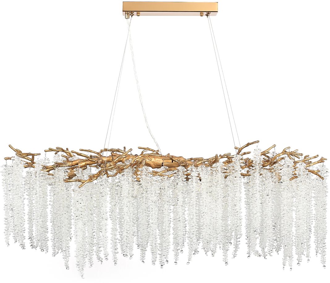 Люстра подвесная вытянутой формы коллекции Eiva / Эйва выполнена из сплава алюминия, гальванизирована в цвет бронзы и декорирована гроздьями из хрусталя в форме октагон. Светильники отличает увеличенное количество хрусталя (120 хрустальных гроздьев), фактурная чеканка на потолочной чаше и лампы с цоколем Е14. Из данной коллекции светильников можно сделать индивидуальный заказ любого цвета и размера.